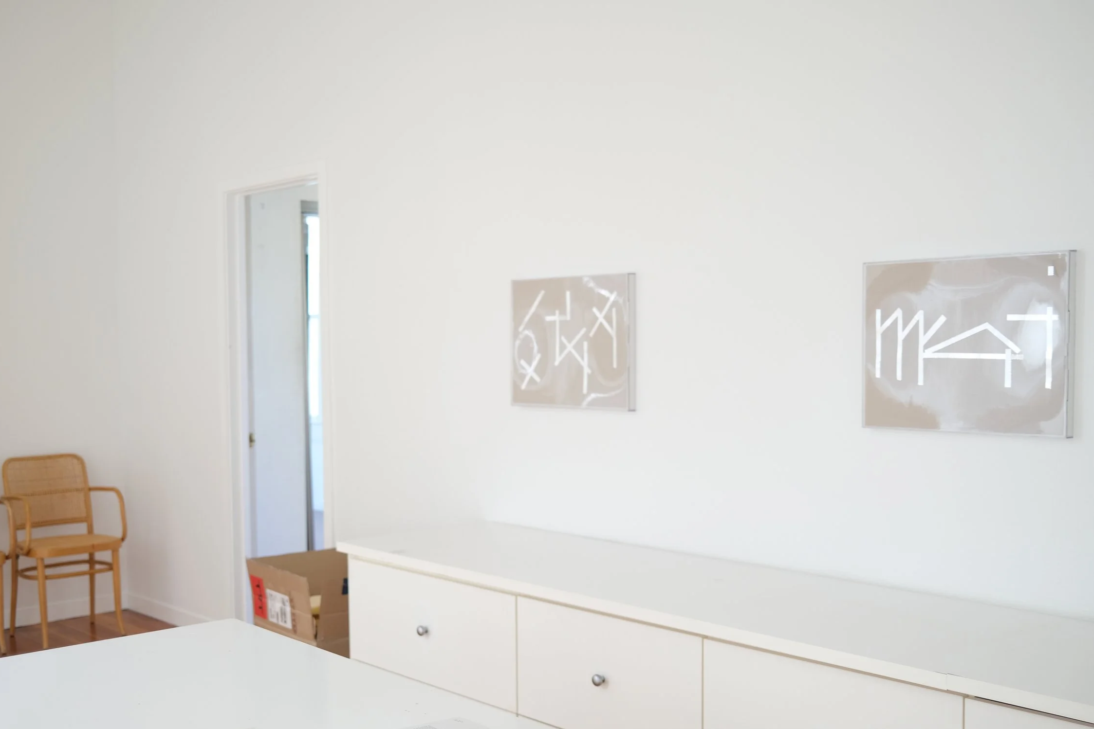 The tape paintings — hieroglyphic images made with electrician's foil on paper — gleam in the light. They are simple marks depicting imagery expropriated from ancient reliefs and pottery. Picking up patterns from the everyday world.